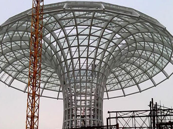 二、球形网架结构因其结构新颖,受力合理,自重轻、用钢量低等优点。如大型体育场馆球形桂林螺栓球网架、公共场馆球形网架、电厂桂林螺栓球网架、水泥工业球形网架、仓储物流球形网架、桂林干煤棚工业球形网架、桂林收费站桂林加油站球形网架、展览中心、影剧院、商场、航站楼、候车厅、工厂桂林车间、仓库、电视塔等球形螺栓球节点网架。国内球形网架结构主要分为:桂林焊接球节点网架及螺栓球节点网架两种。螺栓球节点网架其构件工厂内加工量较大,现场安装便捷,适用于现场工期紧,桂林施工条件、用电量受制约,网架形状复杂、桂林杆件定位困难的异形结构。螺栓球节点球形网架系统基本由桂林杆件、螺栓球、支撑支座等组成。按照节点形式可分为交叉桂林桁架体系、四角锥体系、三角锥体系等。支撑方式多为固定支座支撑。对于大面积、大跨度及有特殊受力或伸缩要求的网架结构可采用橡胶支座、滑移支座、球铰支座等支撑形式,以满足结构自身的受力稳定、均衡,便于内力释放等设计要求。